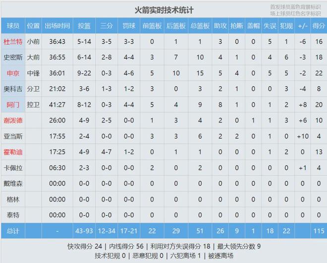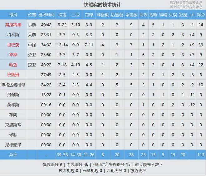 申京22分15板5助4断、阿门20分9板8助、史密斯18分10板4助、杜兰特16分3助;祖巴茨33分7板2帽、伦纳德24分9板4助5断、哈登22分3板7助3断。快船状元签概率升至14%,和奇才、鹈鹕并列联盟第一,但是快船得送给雷霆!