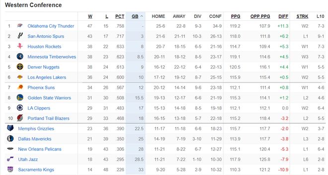 最新的西部排名:雷霆、马刺、火箭、森林狼、掘金、湖人、太阳、勇士、快船、开拓者、灰熊、独行侠、鹈鹕、爵士、国王。