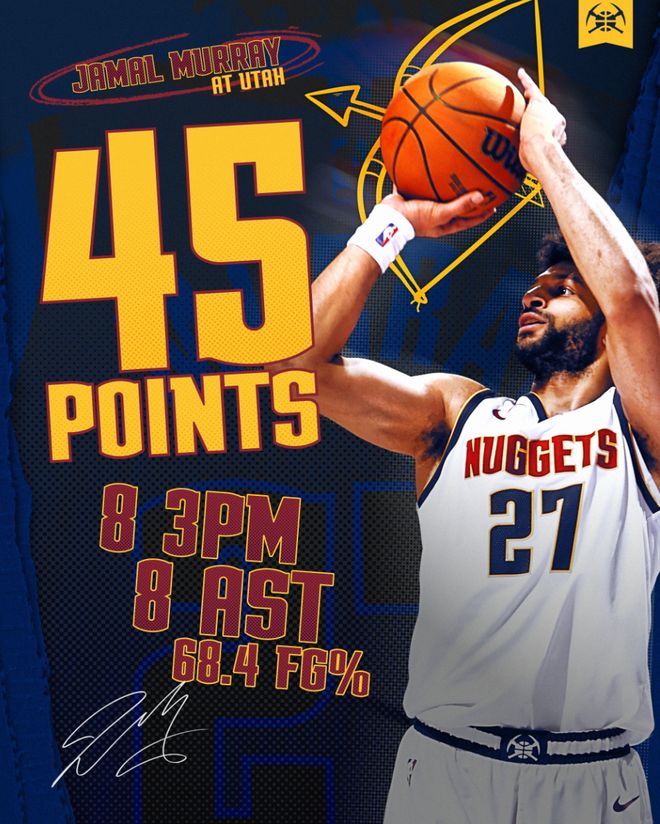 掘金终于结束了二连败,这场比赛约基奇22分12篮板5助攻3失误,但穆雷全场比赛19中13+三分13中8+罚球12中11拿到45分8助攻2篮板2抢断,美中不足是出现7个失误,掘金近期的状态不佳,此役也仅仅赢了西部鱼腩爵士3分。