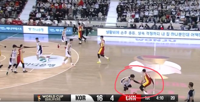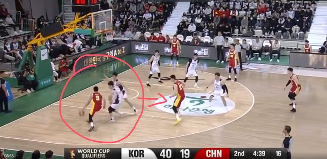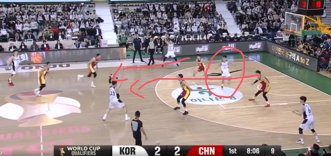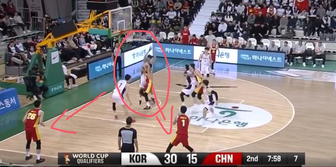 这一球就是程帅澎和曾凡博过度关注弧顶持球的韩国队员,漏掉了油漆区下顺的人